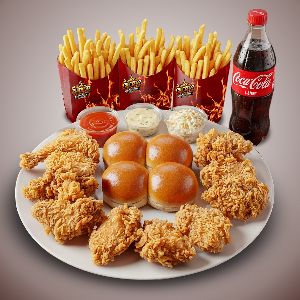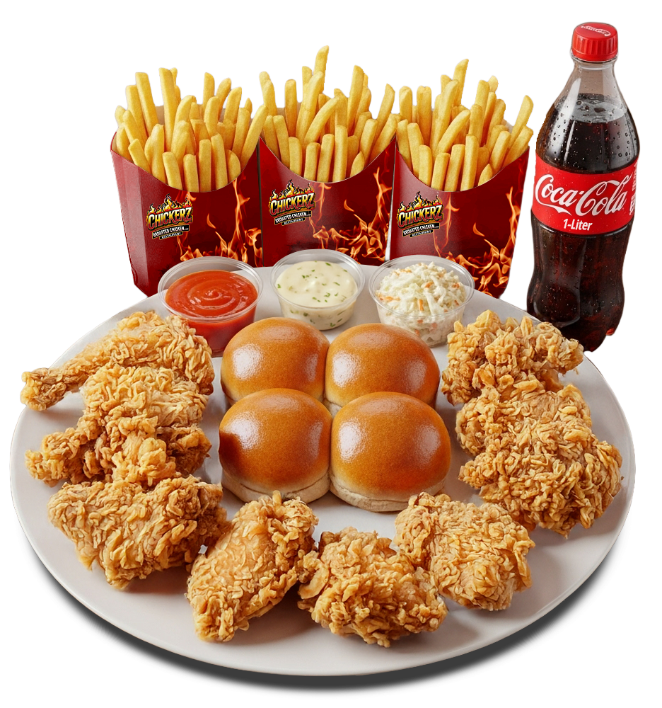 8 Crispy chicken with our secret recipe, served with golden fries, fresh coleslaw, signature sauce, soft bread, and a refreshing soda.