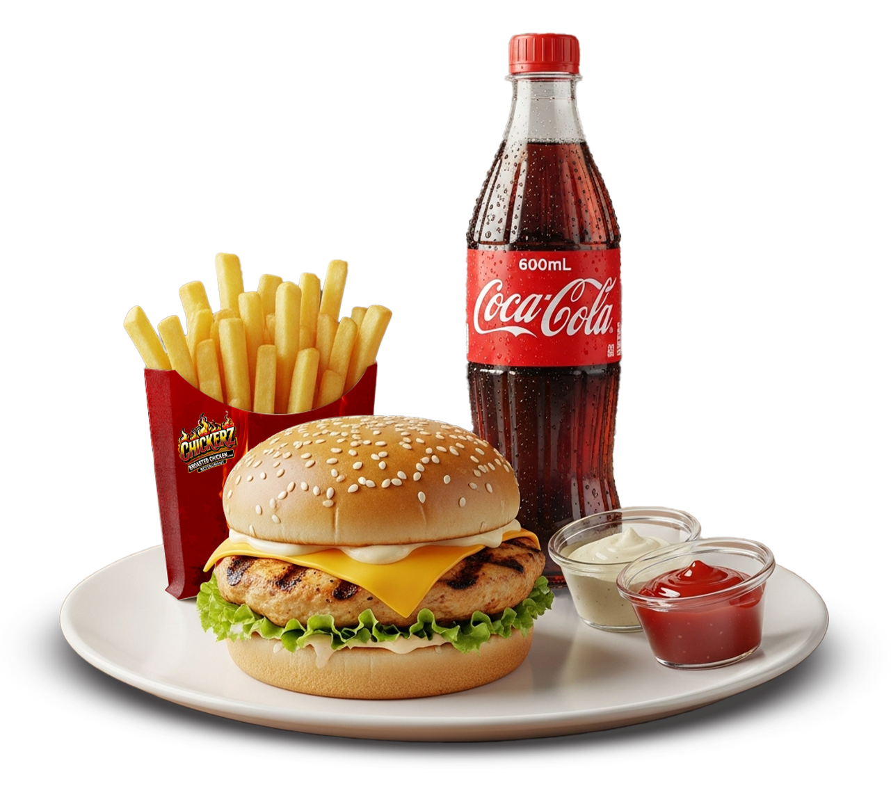 Juicy grilled chicken patty with fresh lettuce, tomato slices, and our signature sauce, served in a soft burger bun.