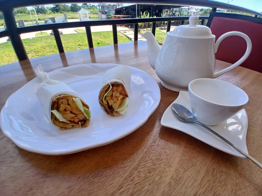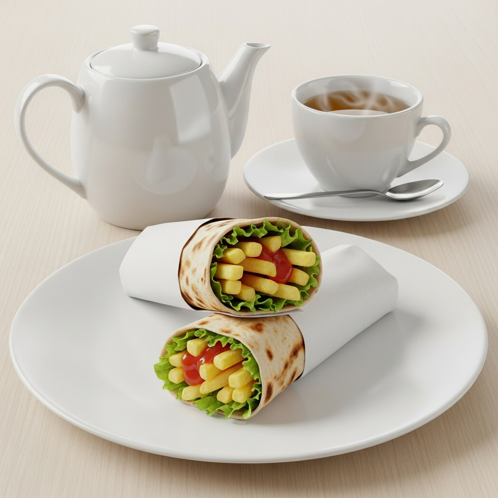 Crispy potato roll with lettuce, cocktail sauce, and hot tea