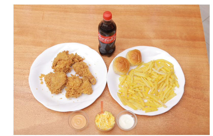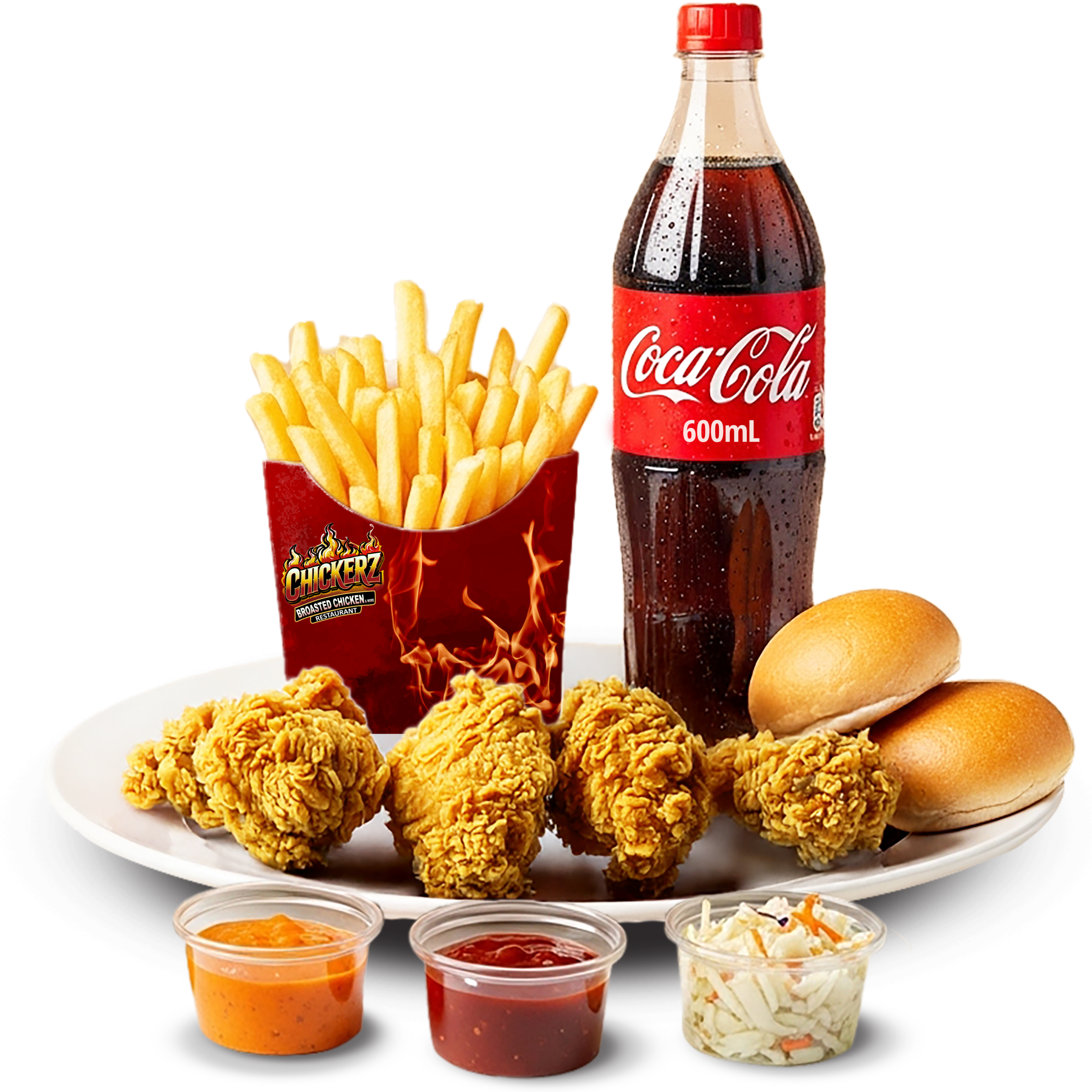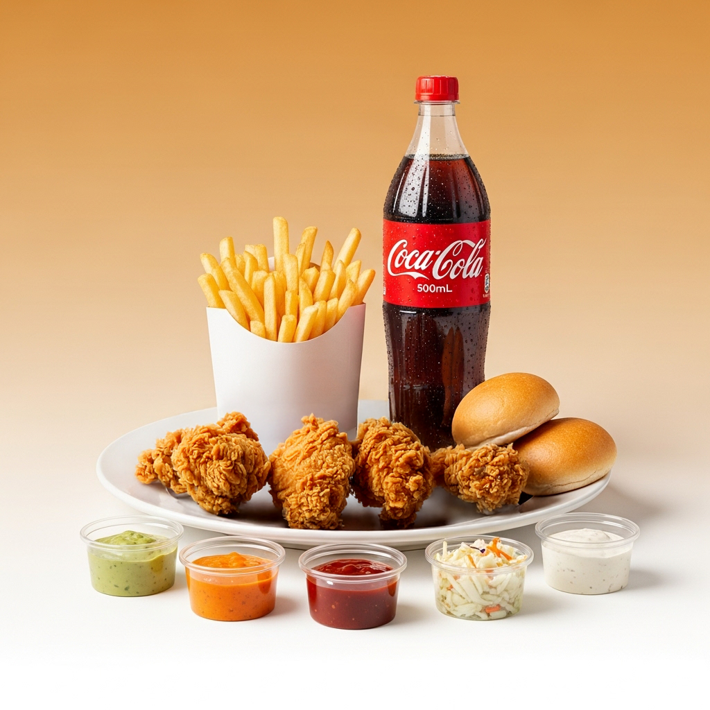4 Crispy chicken with our secret recipe, served with golden fries, fresh coleslaw, signature sauce, soft bread, and a refreshing soda.